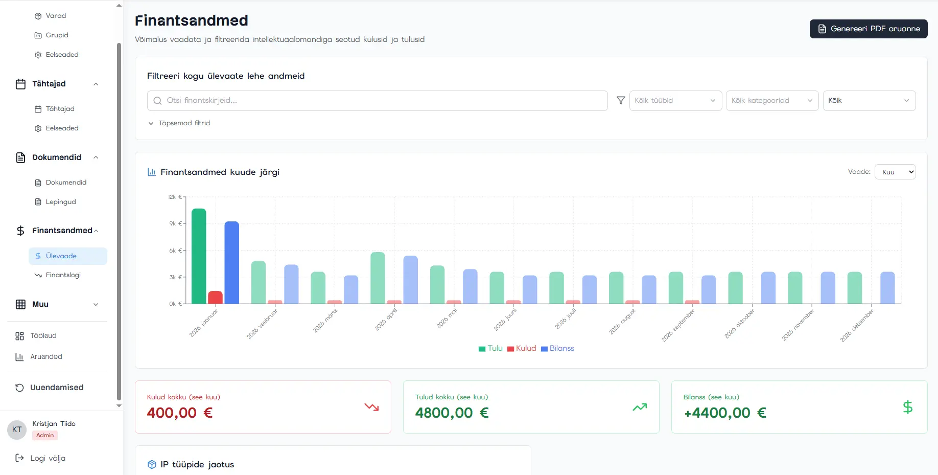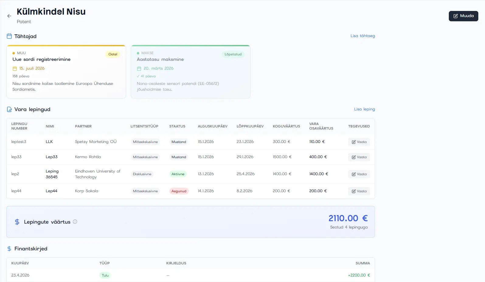 We developed a comprehensive web portal that allows the University of Tartu to more easily manage its 600+ intellectual property assets such as patents, copyrights, trademarks, etc. The platform gives users a 360-degree view of assets, including expiry dates, deadlines, contracts, finances and automated notifications.